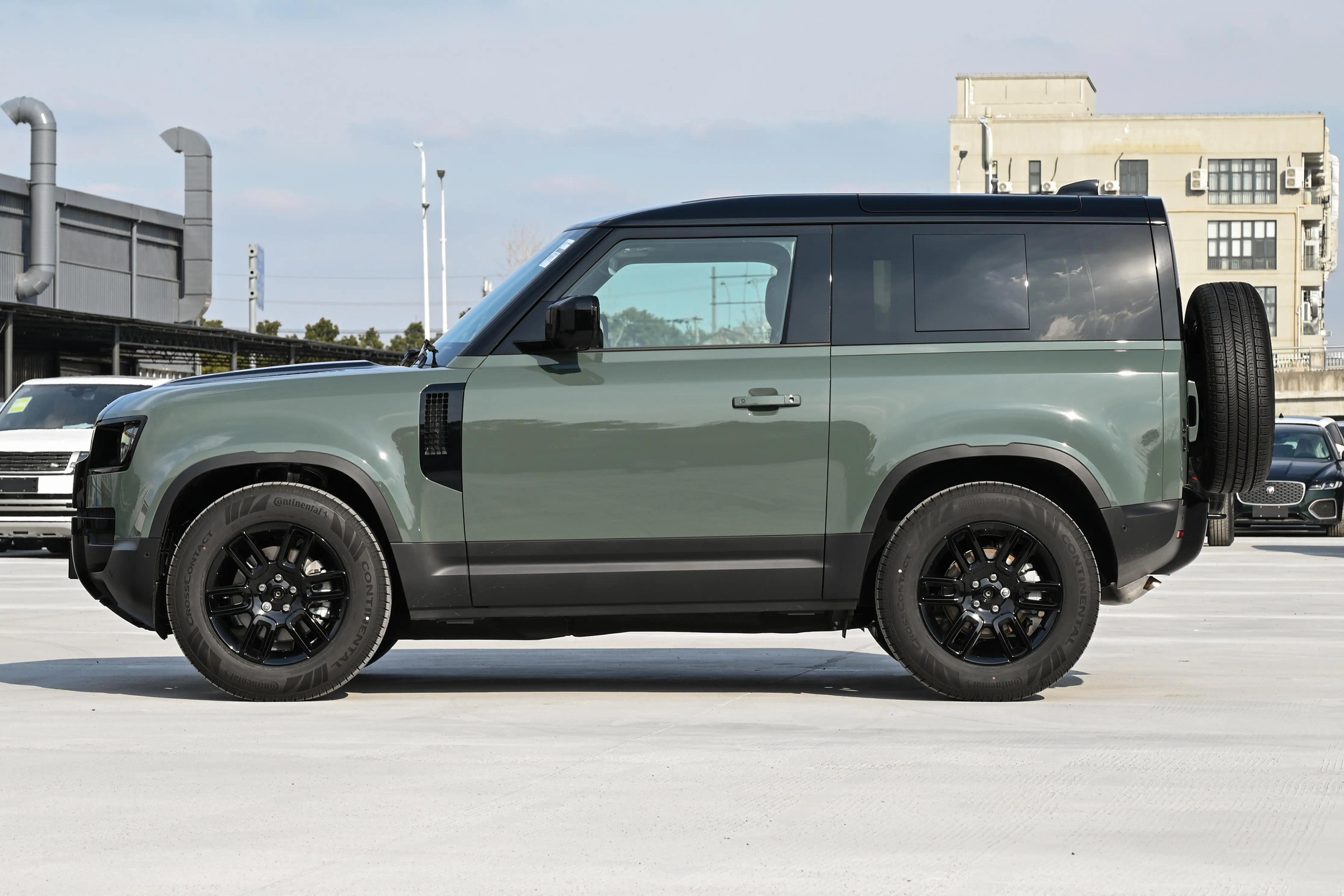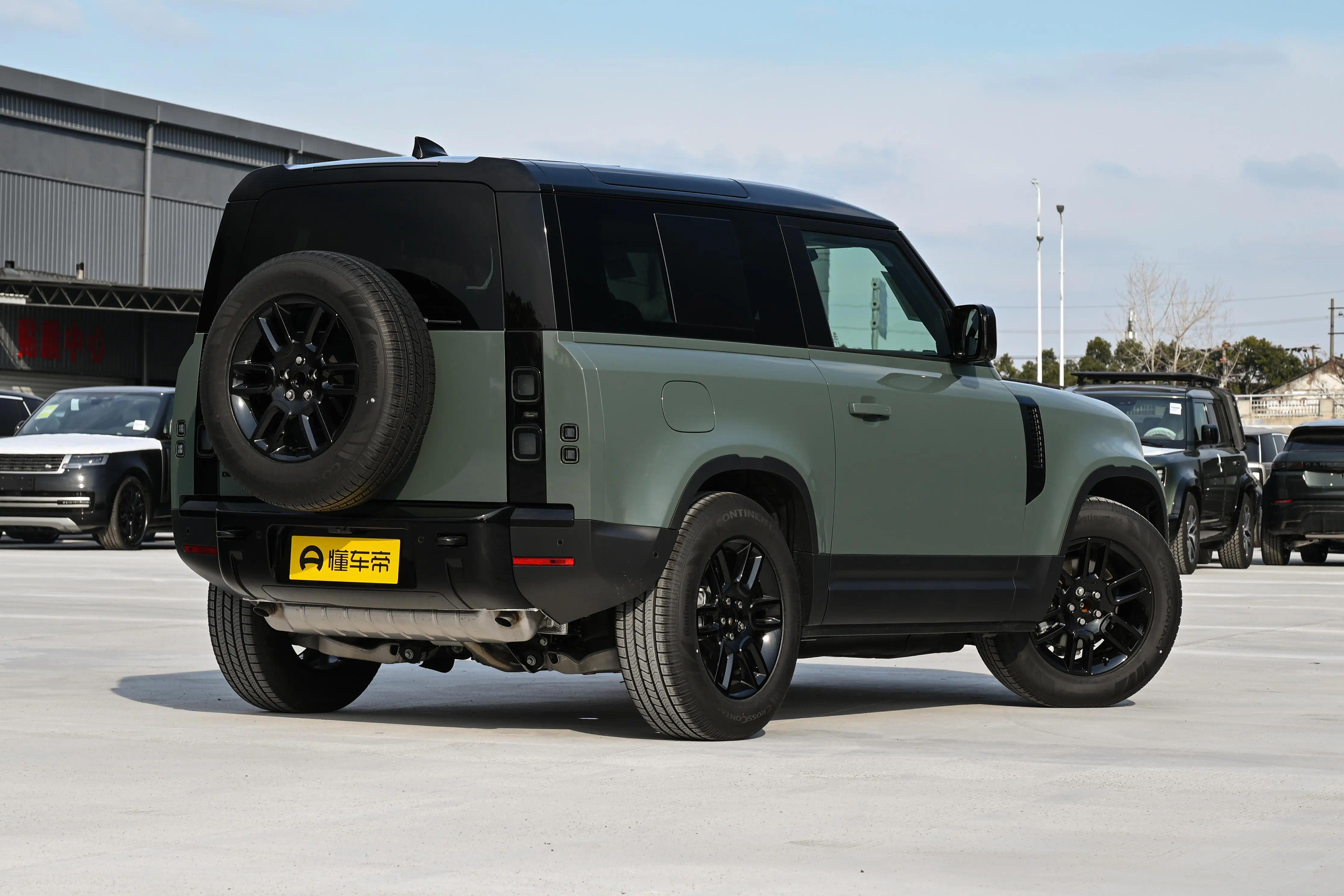 侧面造型方面,车顶线条比较平直,配备有粗壮的行李架,整个车身给人的感觉也比较方正,属于硬派SUV常见的设计语言;腰线采用了贯穿式设计,点缀出了车身侧面的层次感,卫士90采用的双门设计,其余版本均为四门设计;轮眉部分设计有宽体套件,五辐式熏黑轮毂给人的感觉也比较简洁。
